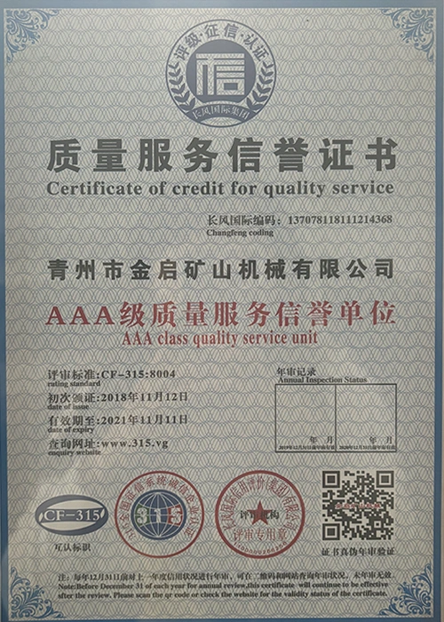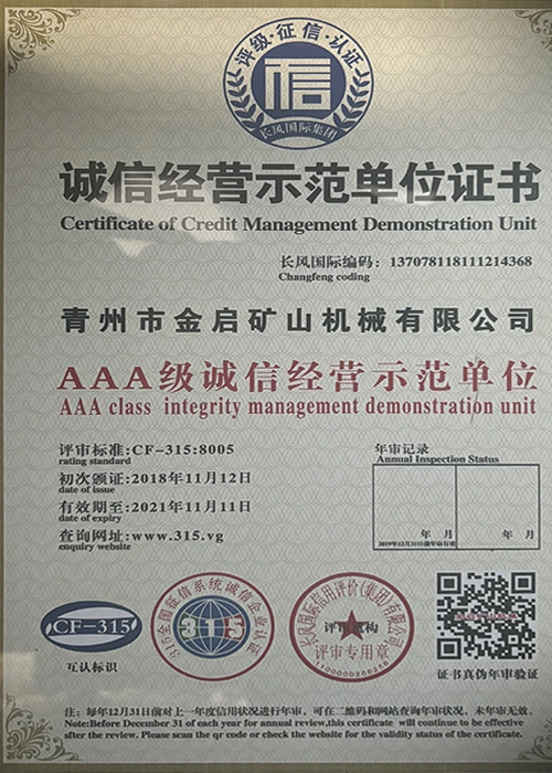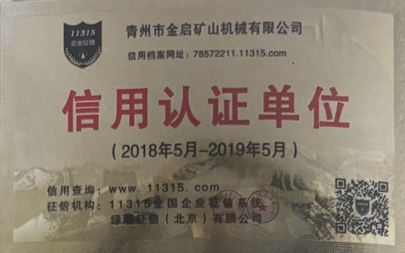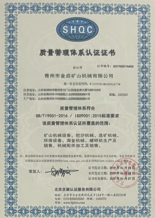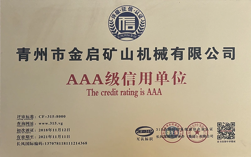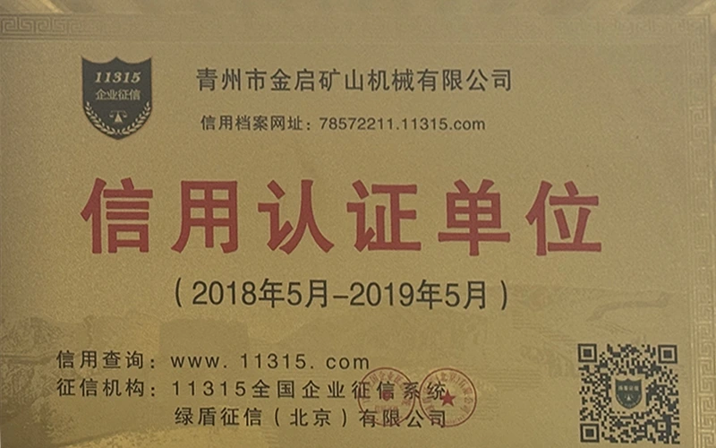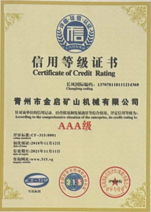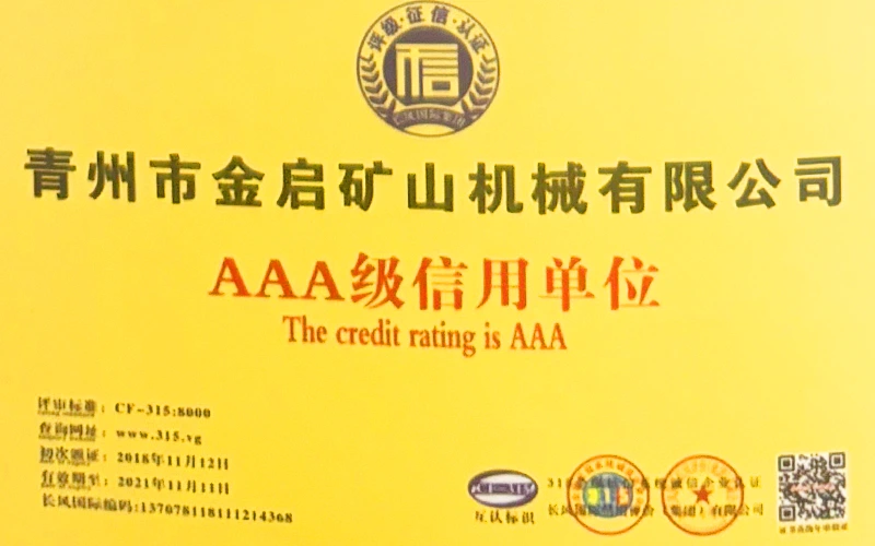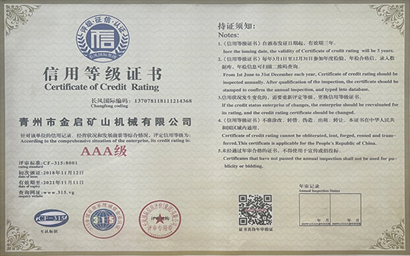 Sanoatda ko'p yillik chuqur tajribaga ega bo'lib, qat'iy sifat nazorati va uzluksiz texnologik innovatsiyalarga tayanib, kompaniya bir qator nufuzli malakalar, sertifikatlar va patent sertifikatlariga ega bo'ldi, jumladan ISO sifat menejmenti tizimi sertifikati, tog'-kon mahsulotlari xavfsizligi sertifikati, shuningdek, ko'plab ixtiro patentlari va foydali modellar patentlari, asbob-uskunalar tuzilmasini optimallashtirish, energiya tizimini optimallashtirish. texnik quvvat va mos ishlab chiqarish kafolati.