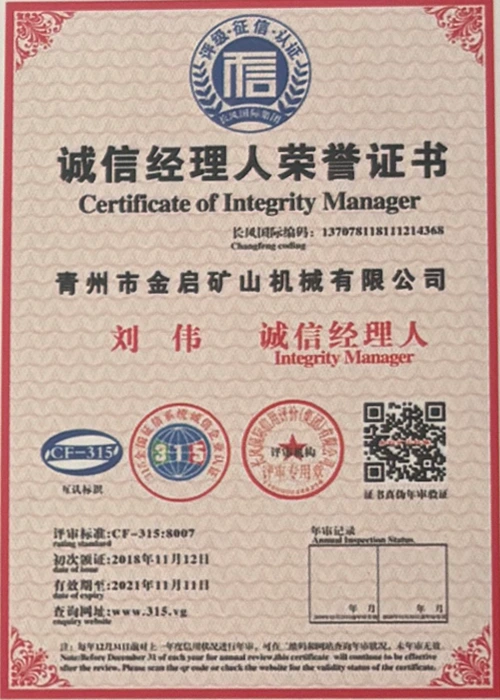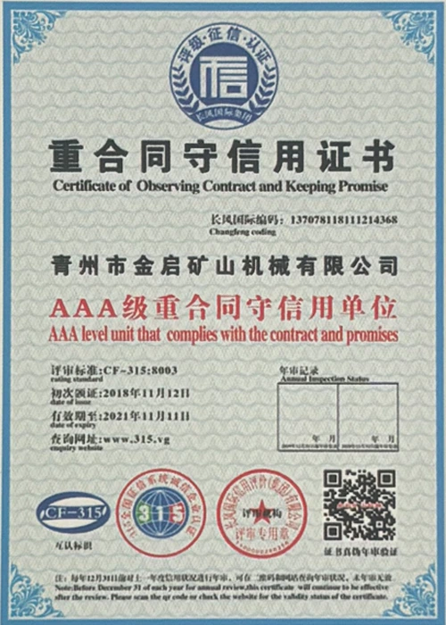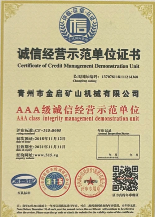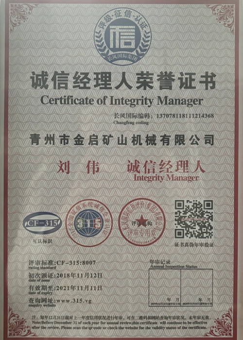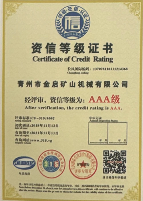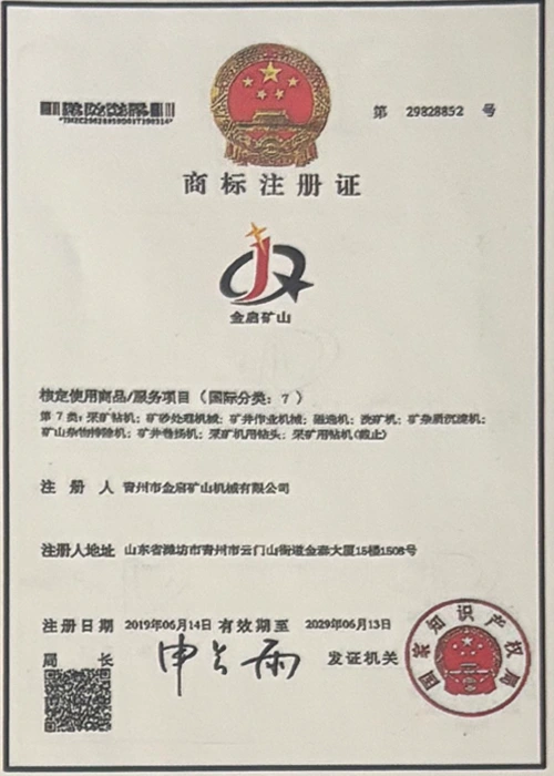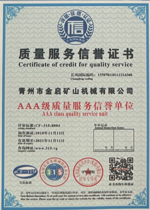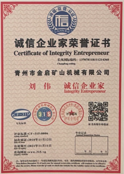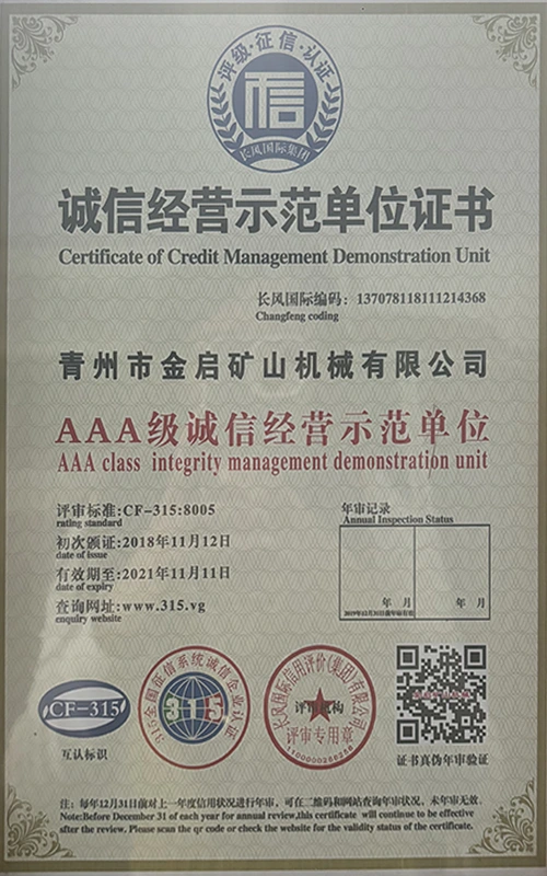 Sanoatda ko'p yillik chuqur tajribaga ega bo'lib, qat'iy sifat nazorati va uzluksiz texnologik innovatsiyalarga tayanib, kompaniya bir qator nufuzli malakalar, sertifikatlar va patent sertifikatlariga ega bo'ldi, jumladan ISO sifat menejmenti tizimi sertifikati, tog'-kon mahsulotlari xavfsizligi sertifikati, shuningdek, ko'plab ixtiro patentlari va foydali modellar patentlari, asbob-uskunalar tuzilmasini optimallashtirish, energiya tizimini optimallashtirish. texnik quvvat va mos ishlab chiqarish kafolati.